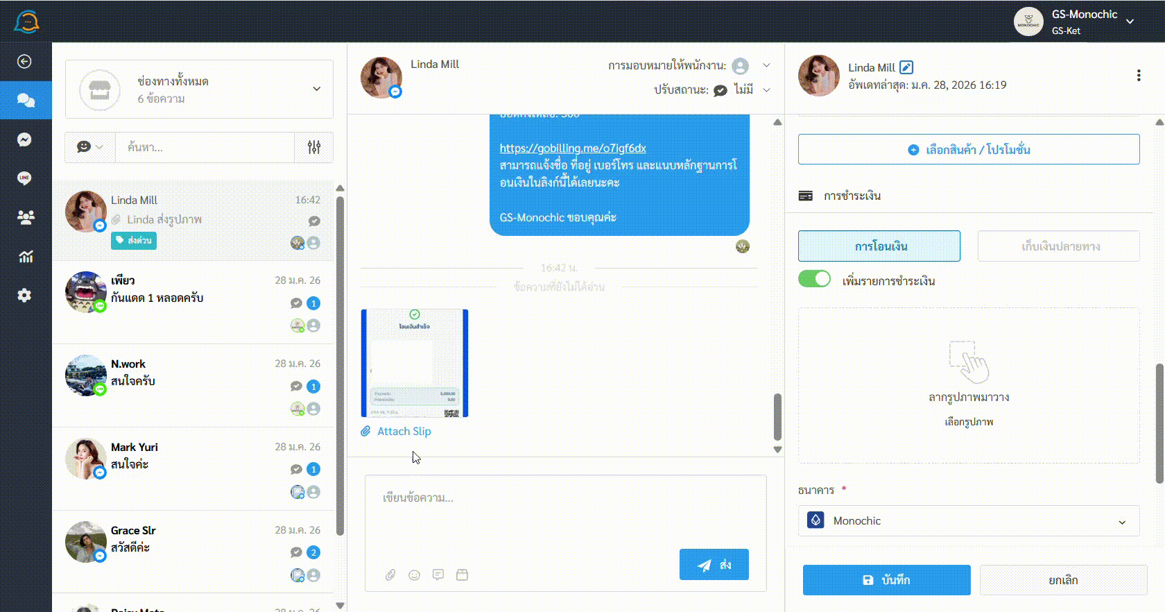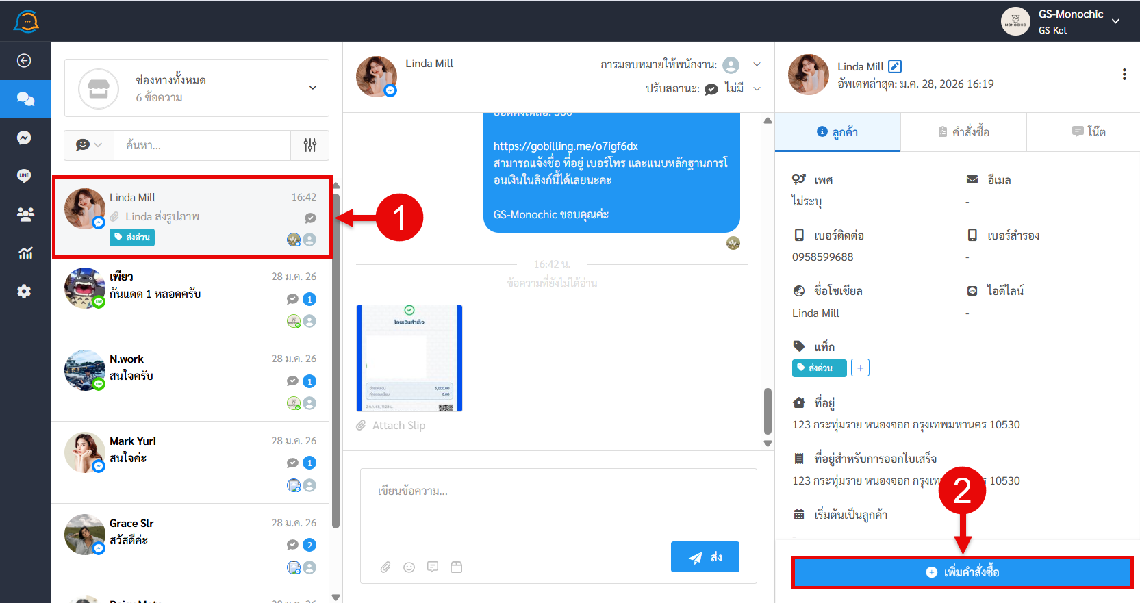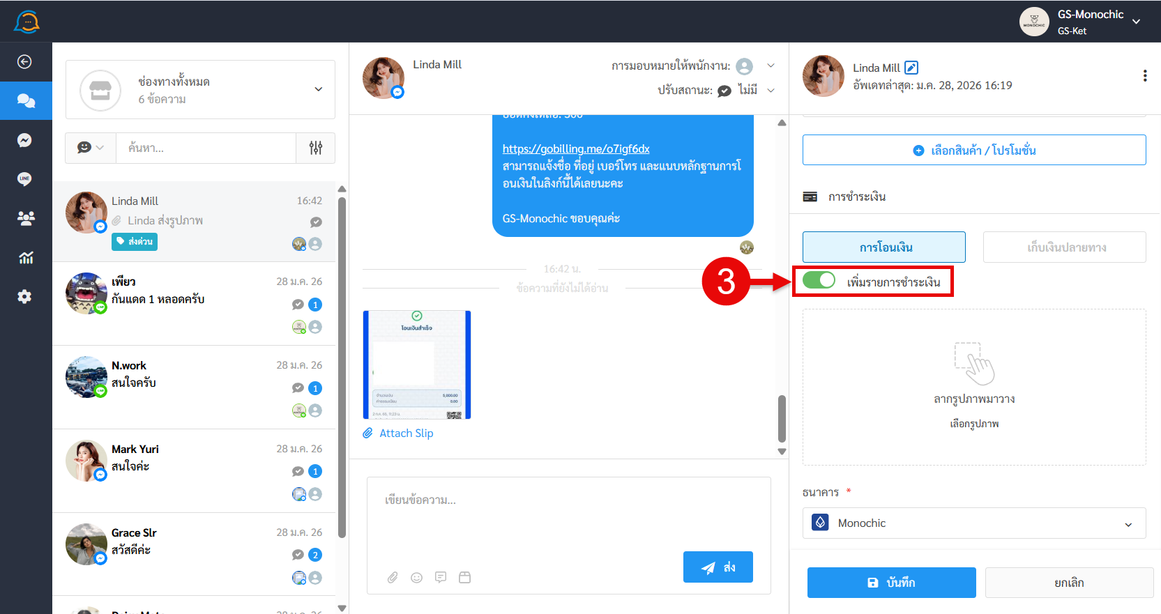 - เข้าไปที่หน้าแชทของลูกค้าที่แนบสลิปโอนเงินเข้ามาในรวมแชท