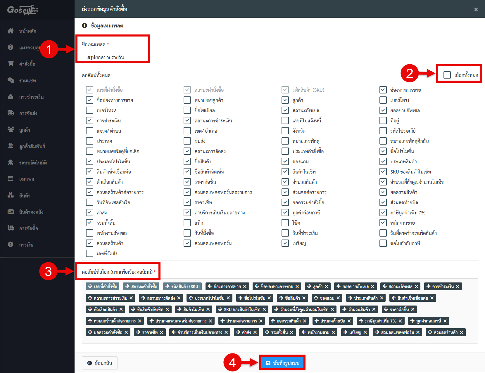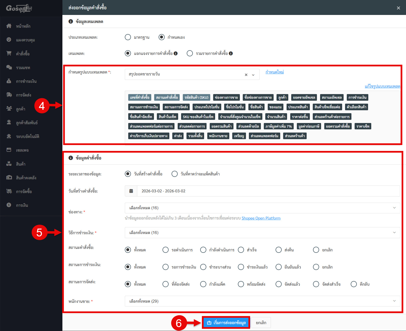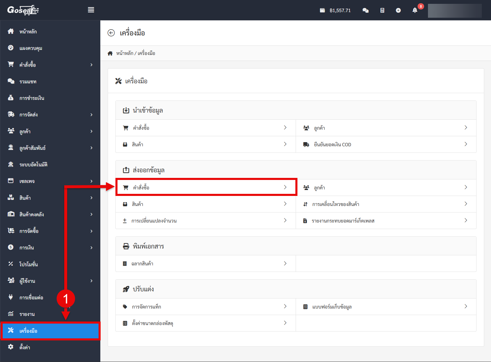 ไปที่เมนูเครื่องมือ เลือกส่งออกข้อมูลคำสั่งซื้อ