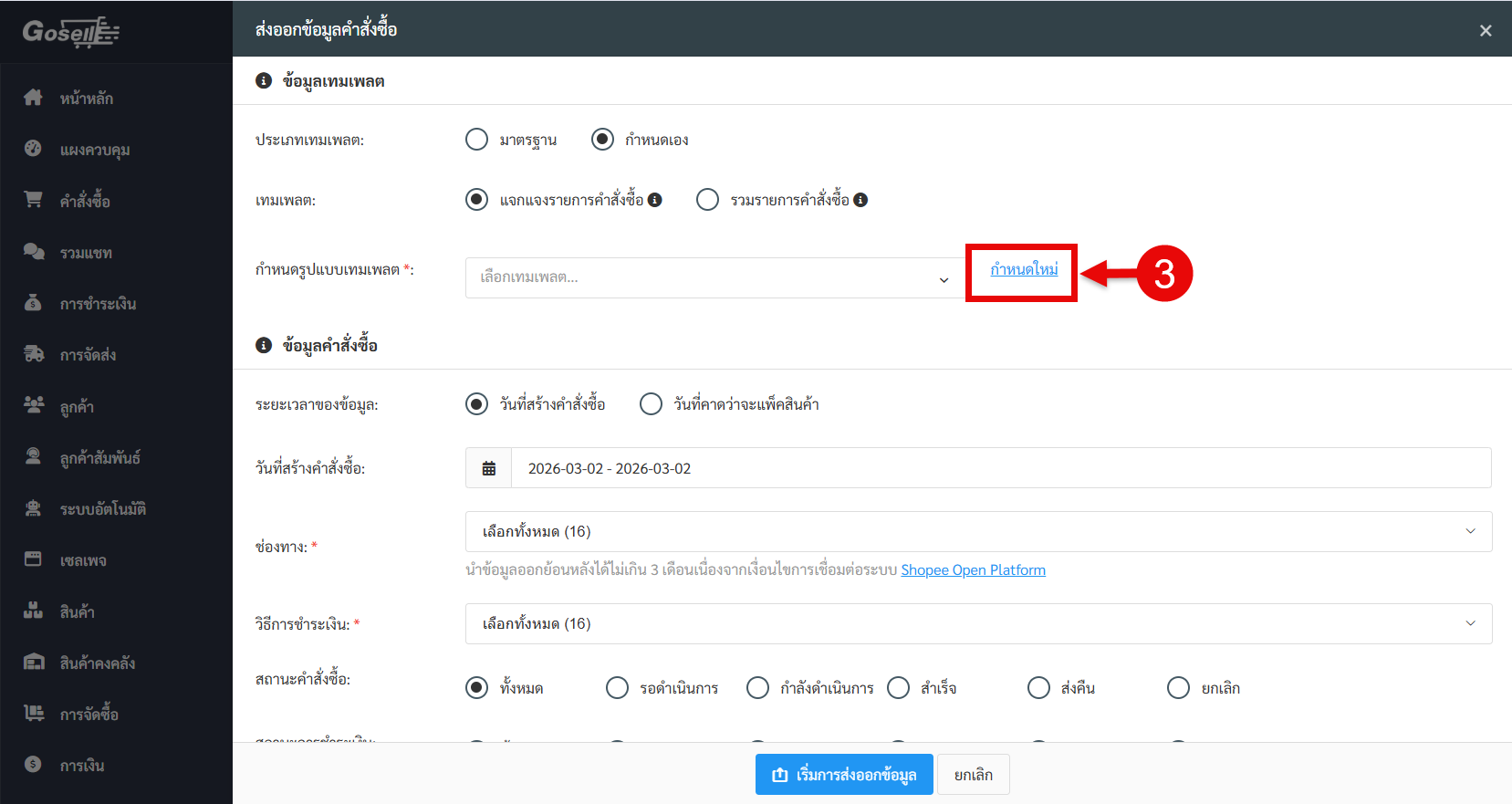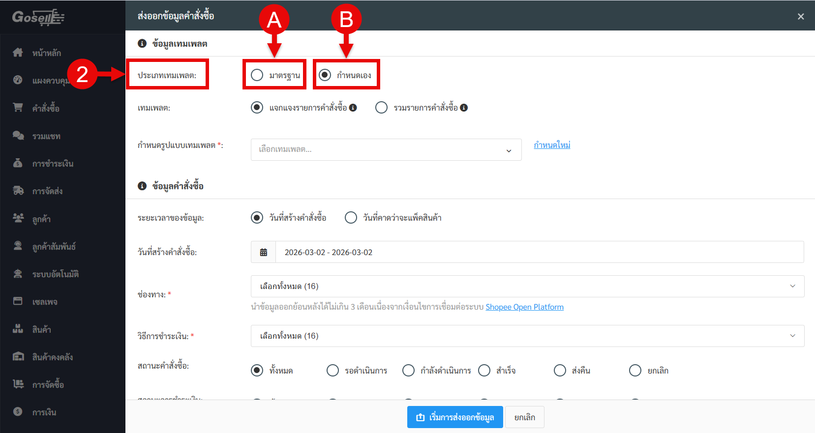 ระบบได้เพิ่ม ประเภทเทมเพลต “กำหนดเอง” ในการออกข้อมูลคำสั่งซื้อ เพื่อให้ร้านค้าสามารถเลือกคอลัมน์ที่ต้องการส่งออกเฉพาะข้อมูลที่ต้องการและบันทึกเทมเพลตไว้ใช้งานในครั้งถัดไปได้ ลดขั้นตอนการแก้ไขไฟล์หลัง Export เป็นไฟล์ Excel