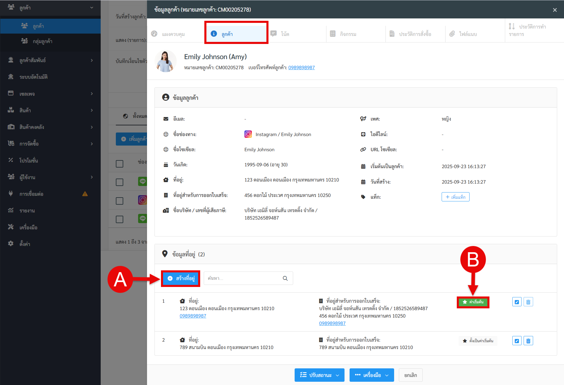 แถบลูกค้า จะสามารถเพิ่มและจัดเก็บหลายที่อยู่ในโปรไฟล์ลูกค้าได้ รองรับกรณีที่ลูกค้ามีหลายที่อยู่สำหรับการจัดส่งหรือออกใบเสร็จ