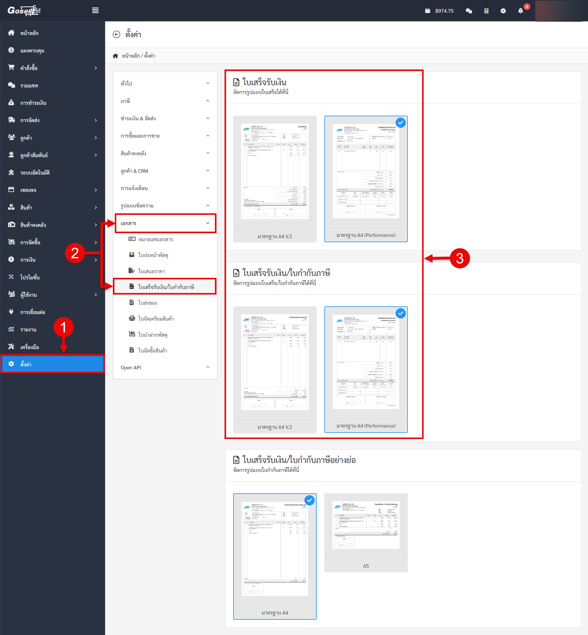 เลือกเมนู เอกสาร คลิก ใบเสร็จรับเงิน / ใบกำกับภาษี
