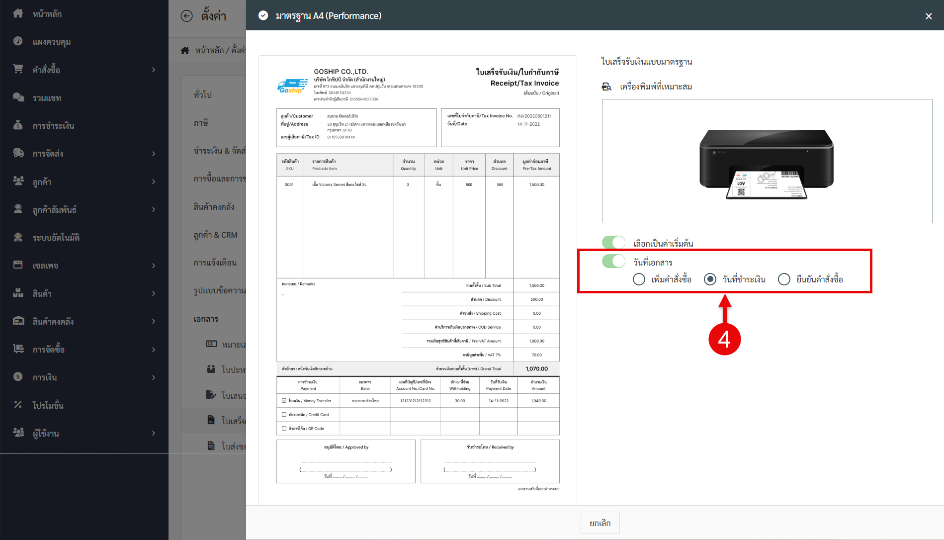 เปิดใช้งานตัวเลือก วันที่เอกสาร และเลือกวันที่ต้องการ ระบบจะแสดงวันที่ที่เลือกบนใบเสร็จ / ใบกำกับภาษีทันที