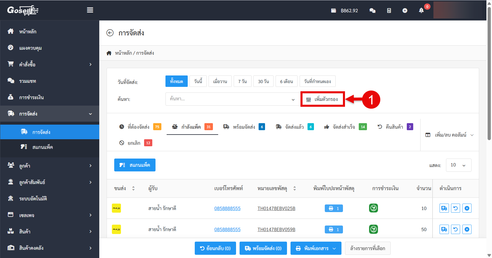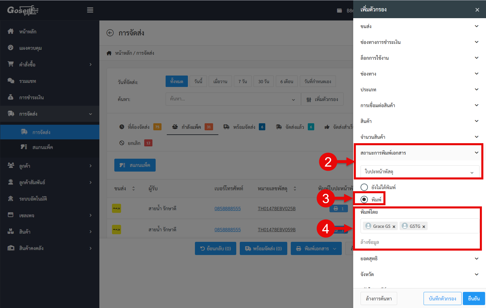 ระบบได้อัปเดตการใช้งานใน เมนูการจัดส่ง โดยเพิ่มตัวกรอง “ผู้พิมพ์เอกสาร” เพื่อช่วยให้ร้านค้าสามารถ ตรวจสอบการทำงานของทีมแพ็กสินค้าได้ง่ายขึ้น ติดตามปัญหาการพิมพ์เอกสารซ้ำ