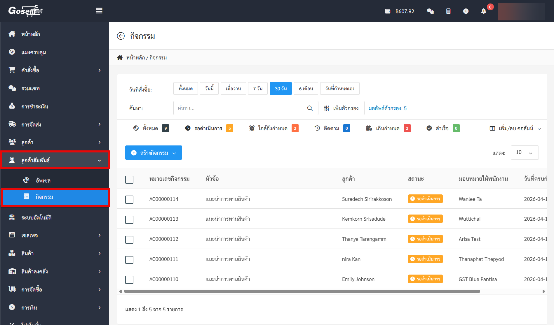 หลังจากนำเข้าไฟล์สำเร็จระบบจะสร้างลูกค้าใหม่พร้อมรายการกิจกรรมให้ทันทีสามารถตรวจสอบได้ที่เมนูลูกค้าสัมพันธ์>กิจกรรม