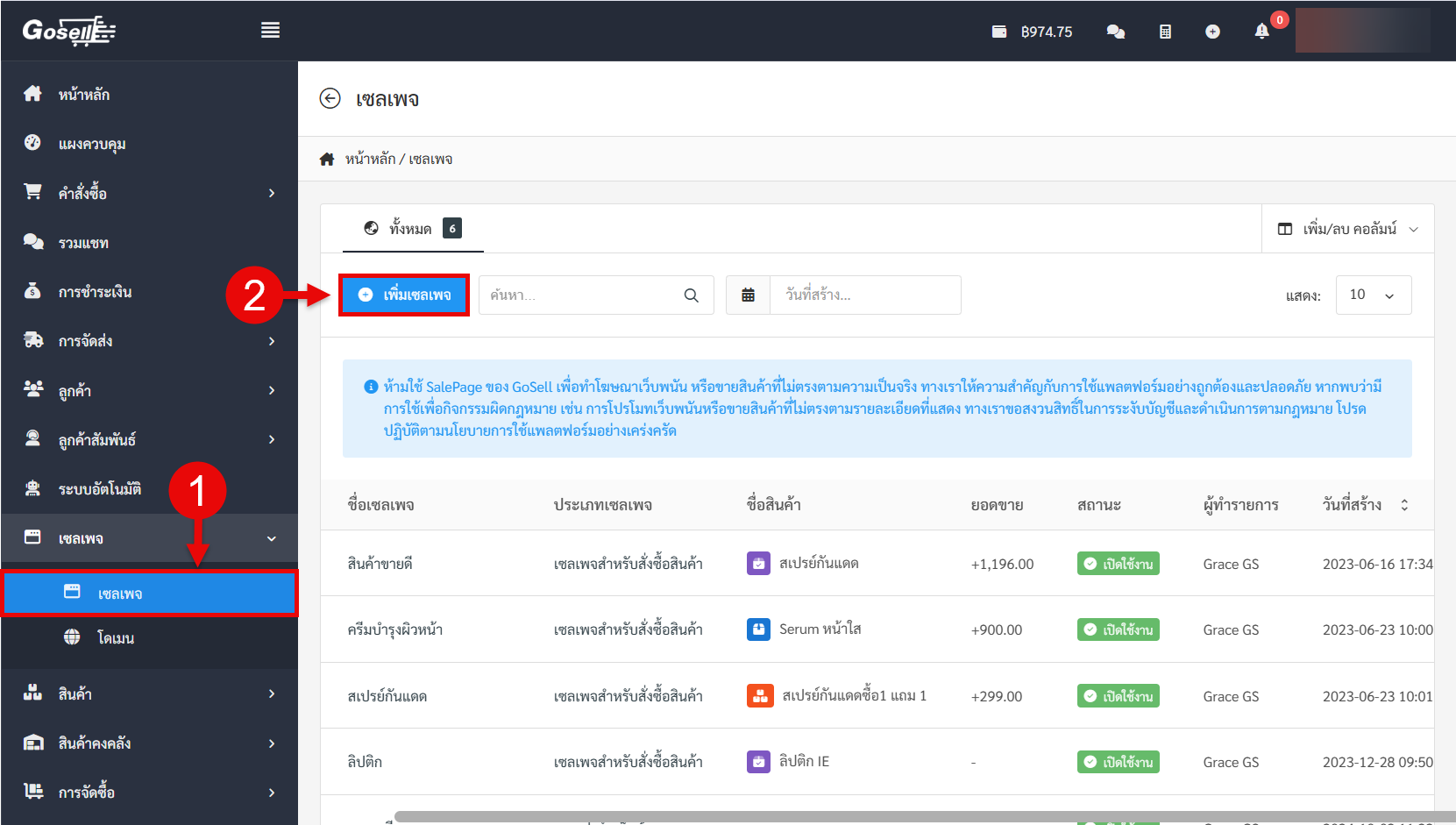 ระบบ Gosell มีการอัปเดตในส่วนของเซลเพจ ได้เพิ่มปุ่ม “เลือกสินค้า” ในขั้นตอนการสร้าง Sale Page เพื่อให้เลือกหรือค้นหาสินค้าในการสร้างเซลเพจได้ง่ายขึ้น
